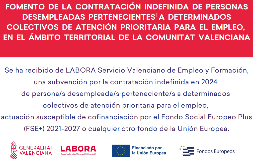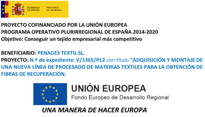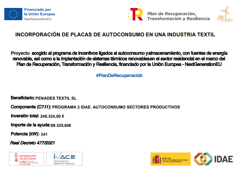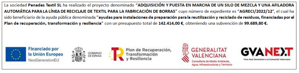 PENADES TEXTIL SL, ha sido beneficiaria de una ayuda del programa de ayudas de LABORA Servicio Valenciano de Empleo destinada a fomentar la contratación indefinida inicial de colectivos de atención prioritaria para el empleo, cofinanciada por la Unión Europea, la Generalitat Valenciana y el Ministerio de Trabajo, Migración y Seguridad Social; por importe de 11.113 euros EXPEDIENTE: ECOVUL/2024/651/46.